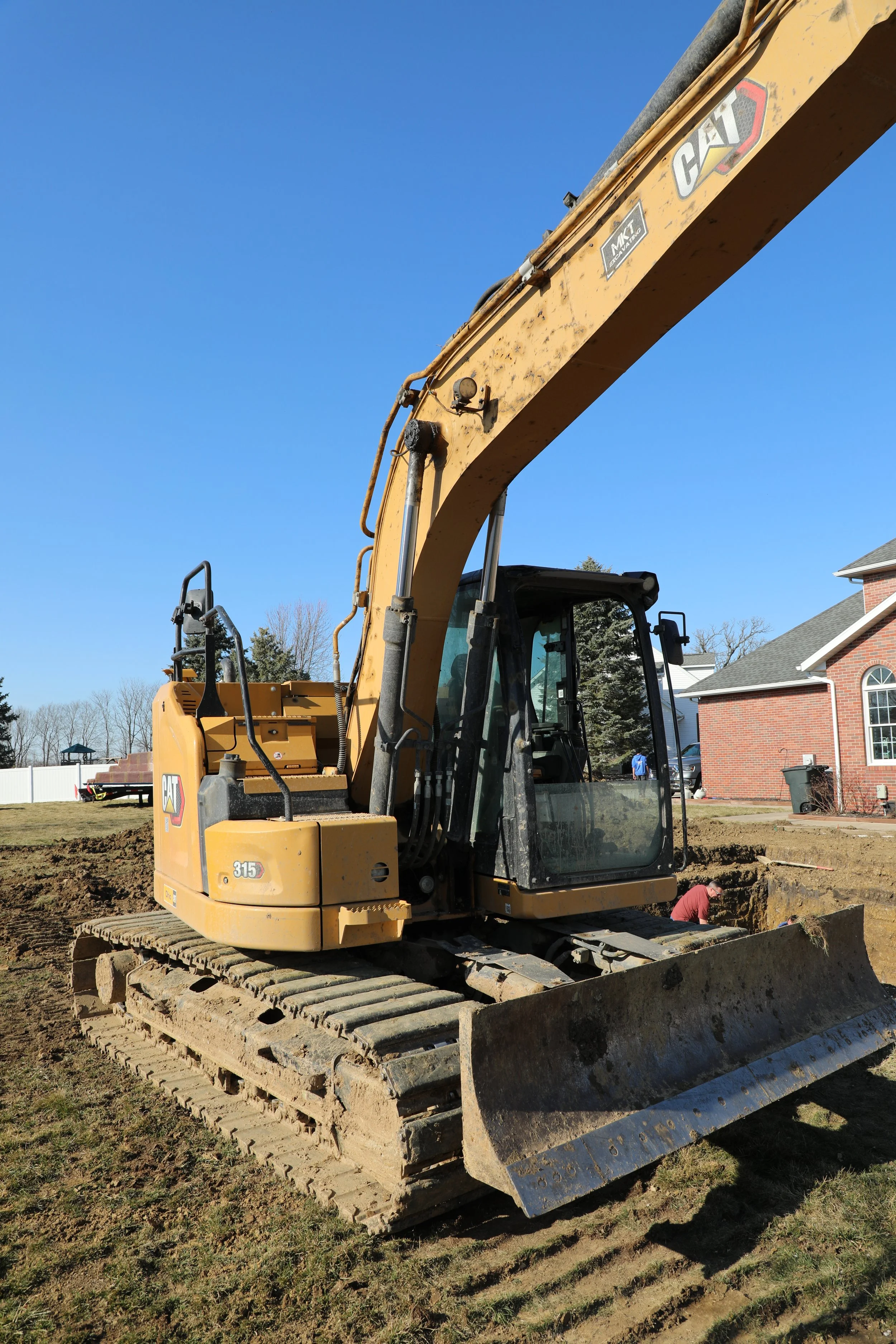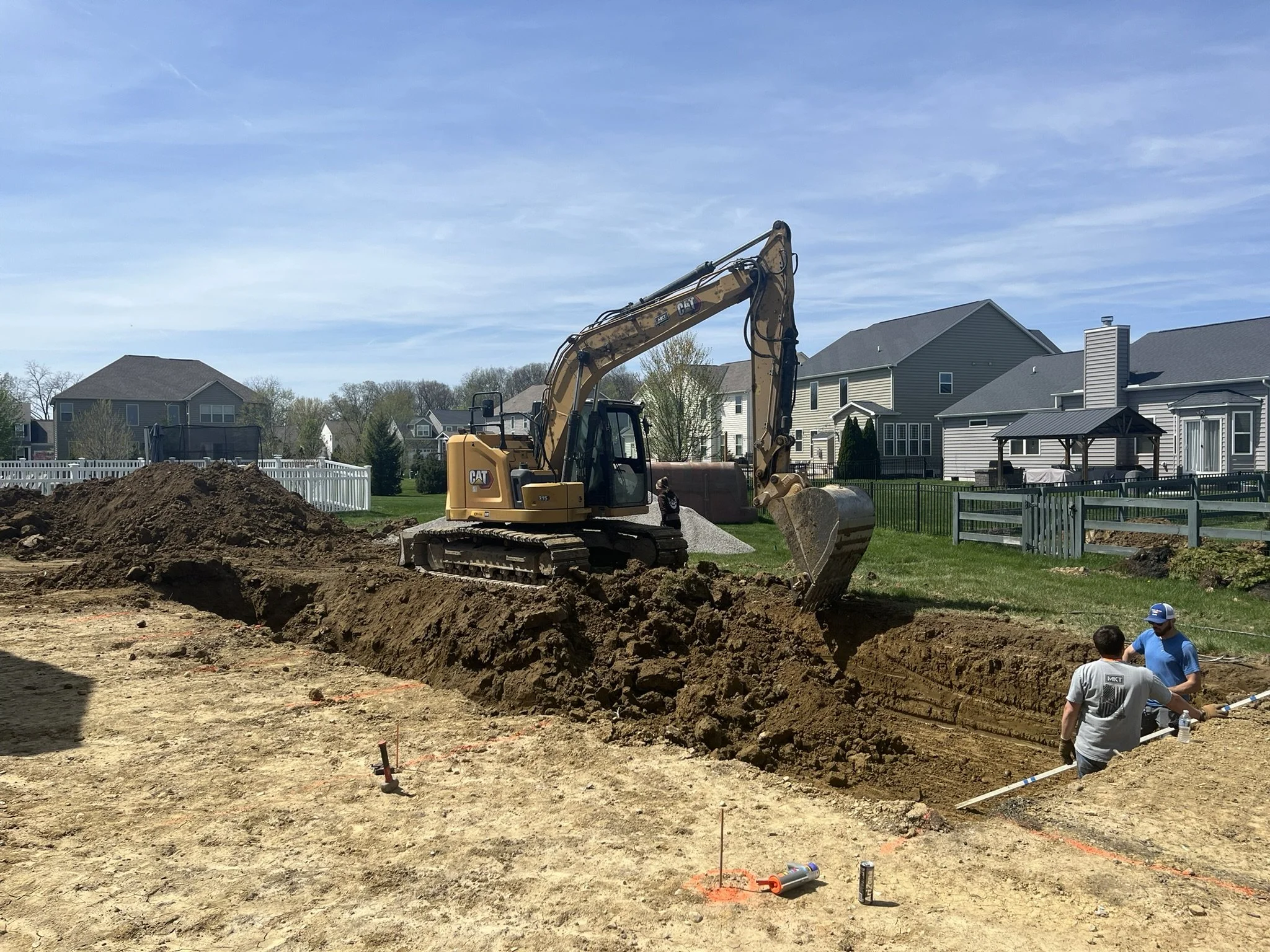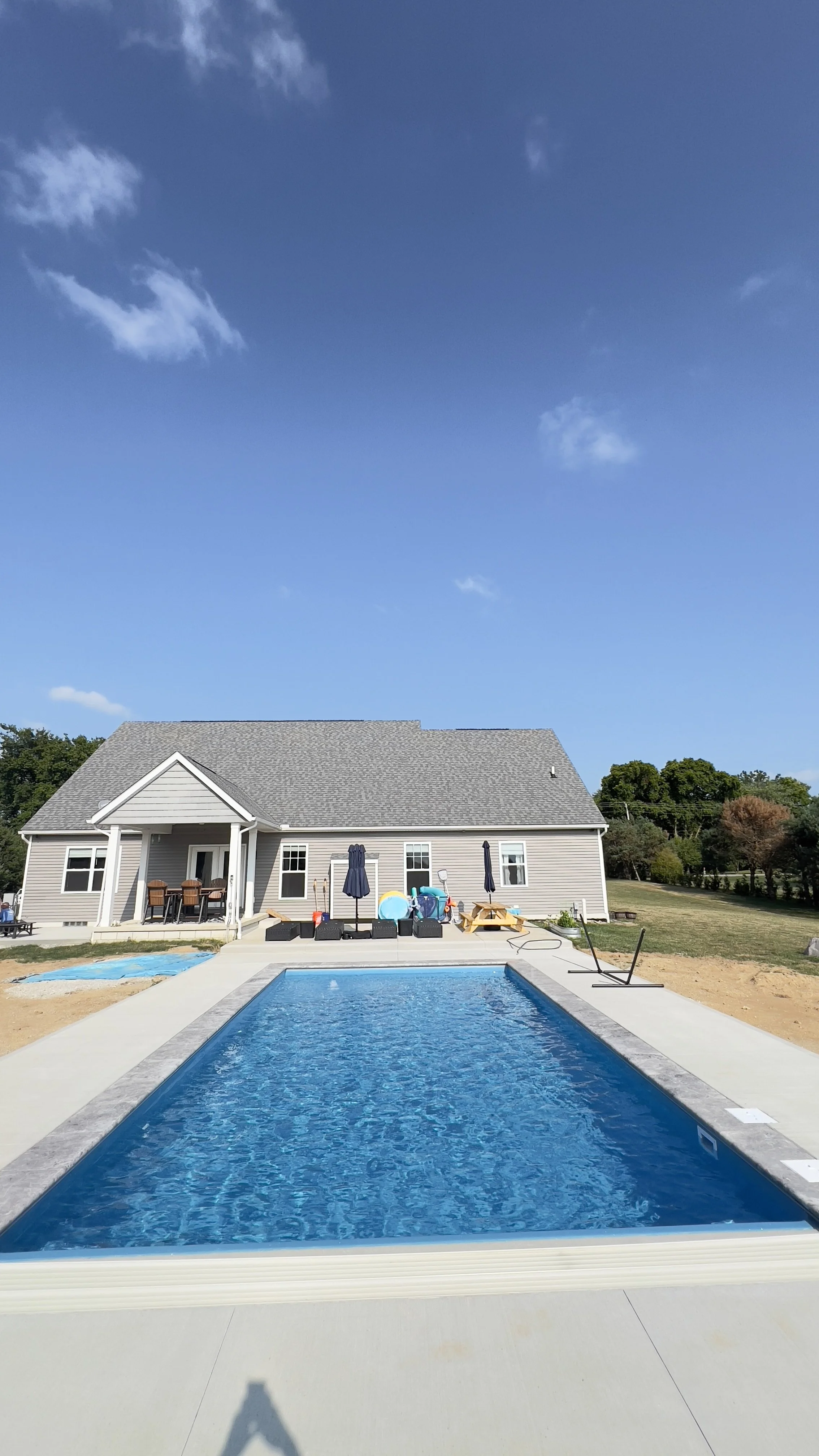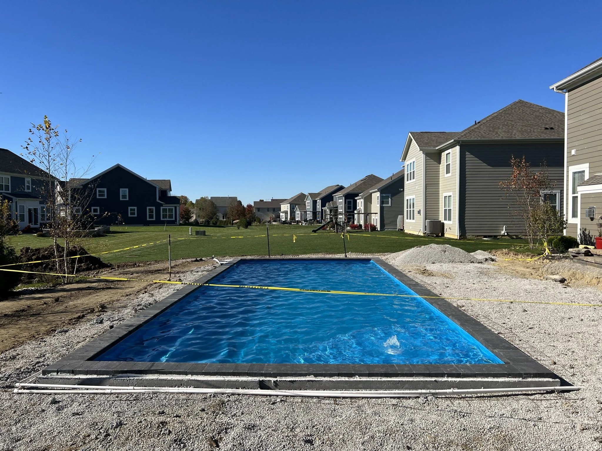 Newly constructed rectangular swimming pool with blue water in a backyard, surrounded by gravel and construction tape, with new homes and a clear blue sky in the background.