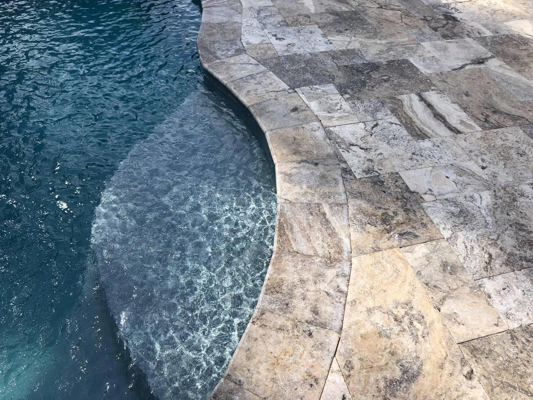 Completed in-ground rectangular swimming pool with light blue water, surrounded by beige stone pavers, in a backyard with green trees and grass, and some construction tools and materials nearby.