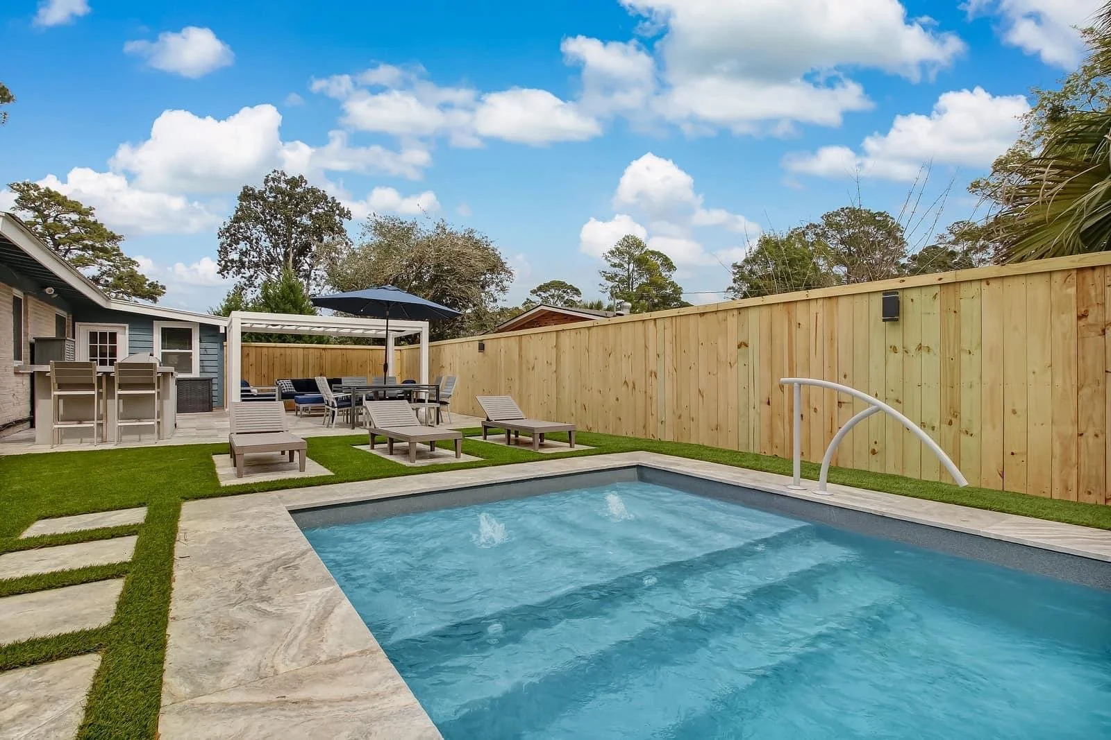 Residential backyard with a swimming pool, lounge chairs, a fence, trees, and neighboring houses on a sunny day.