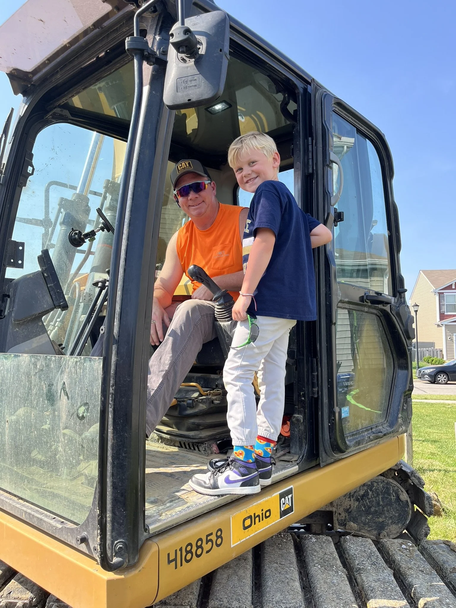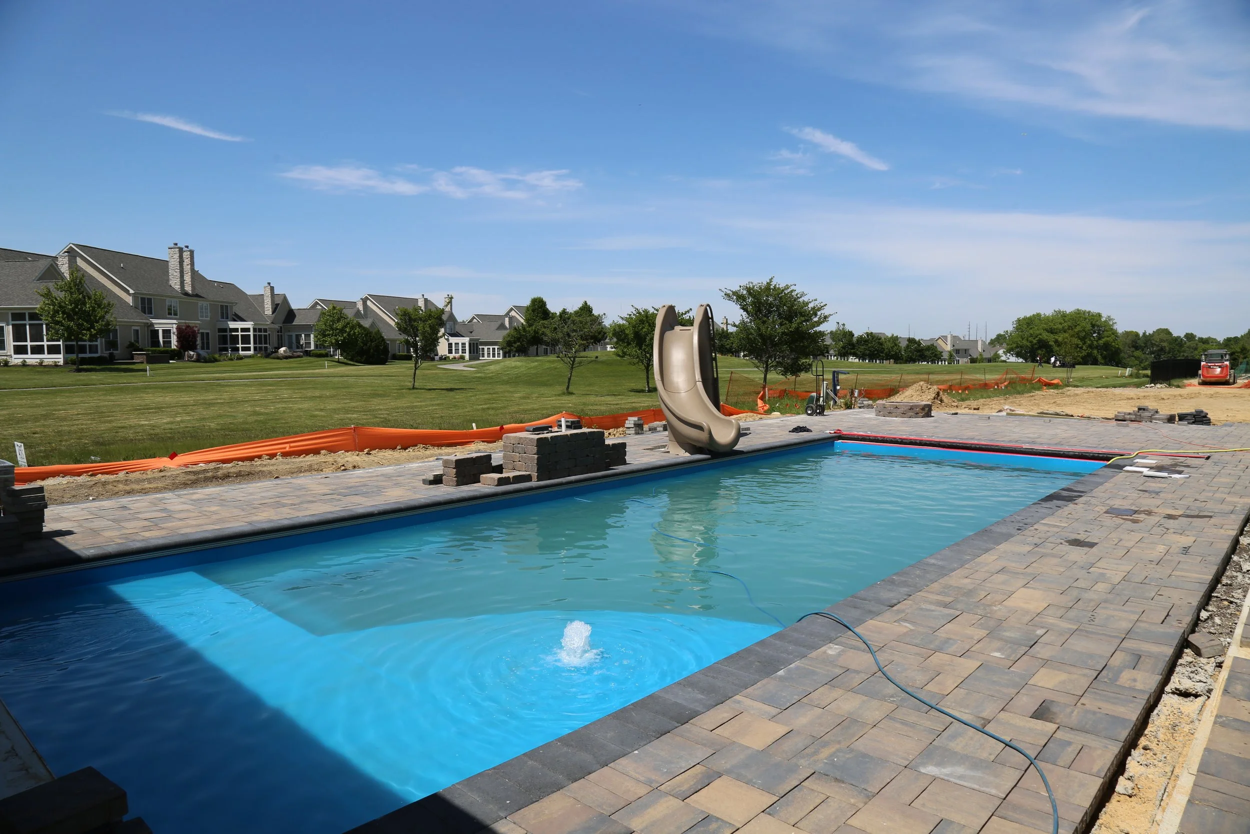 Under construction backyard with a rectangular in-ground swimming pool, beige water slide, brick paver patio, green lawn, trees, and neighboring houses in the background on a sunny day.